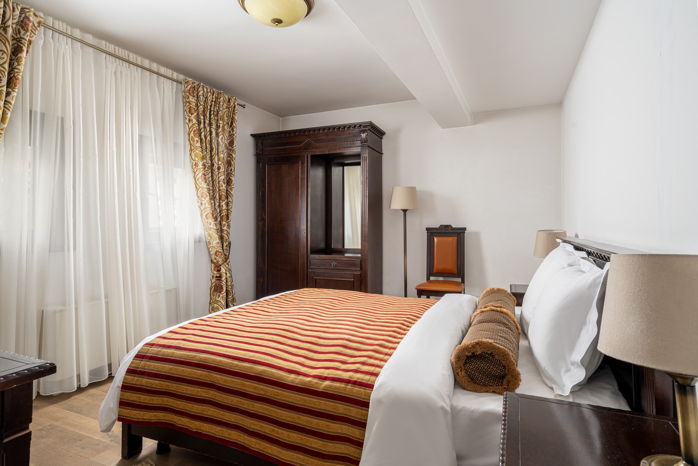 Situată la nivelul grădinii, cu priveliște directă spre munte, camera 103 este un spațiu confortabil și luminos ce poate acomoda 2 persoane, având un pat matrimonial queen size, masă cu 2 locuri care poate servi și ca loc de lucru și baie en-suite cu cadă.