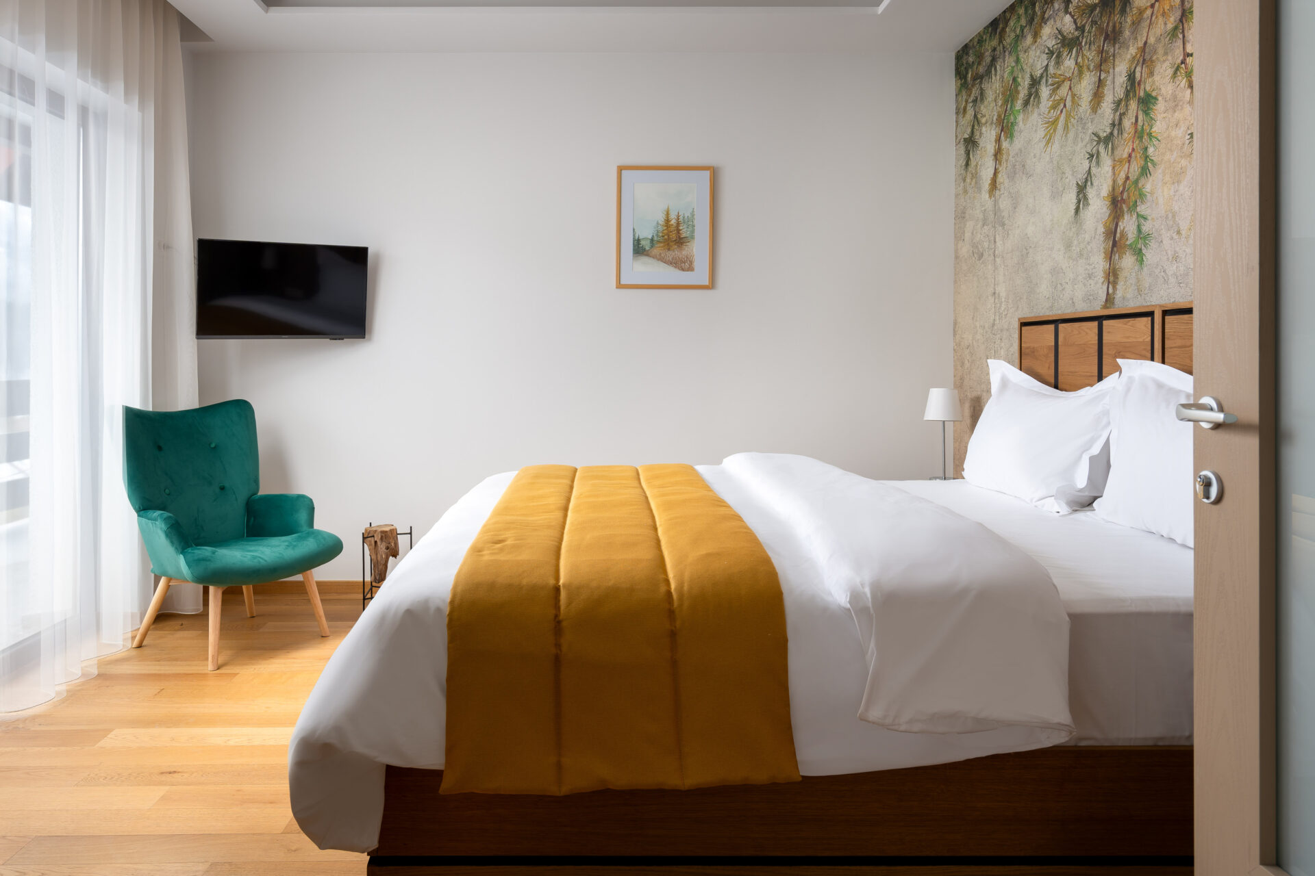 Ambele camere au balcon cu ieșire separată, cu priveliște spre munte și grădină, TV și wi-fi. Apartamentul cuprinde și o baie en-suite, cu chiuvetă dublă și cadă.